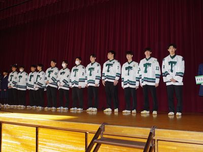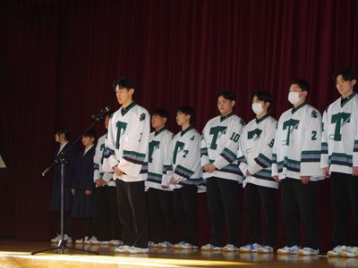 | アイスホッケー部選手代表の決意表明と校長からの激励の言葉をいただきました。 | |